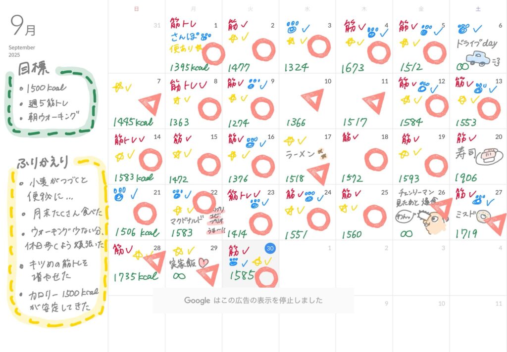 9月序盤、中盤と、かなり安定して1500kcalを守っていたのですが、終盤にやってしまいました。