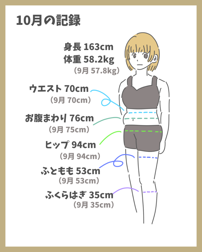 先月9月の記録で、体重が57kg台に入り喜んでいたところですが、10月になり体型がどう変わったのか。早速、確認していこうと思います。