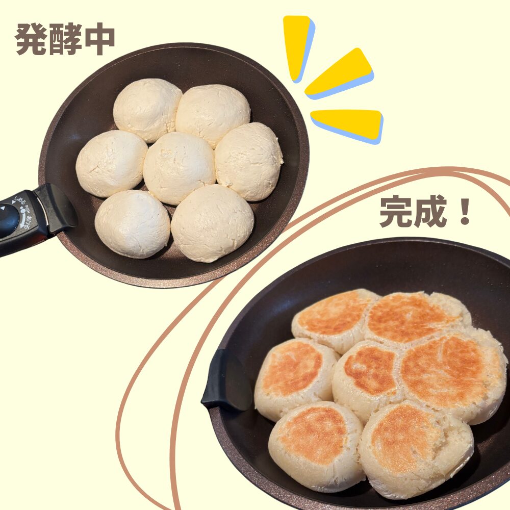 レシピに生地を発酵させて膨らませる工程があるのですが、IHコンロでフライパンが温まらなかったのか室温が低かったのか、なかなか生地が膨らまなかったので、濡れ布巾をレンジで温めフライパンを外から覆ってみました。(無事に膨らんでよかった)